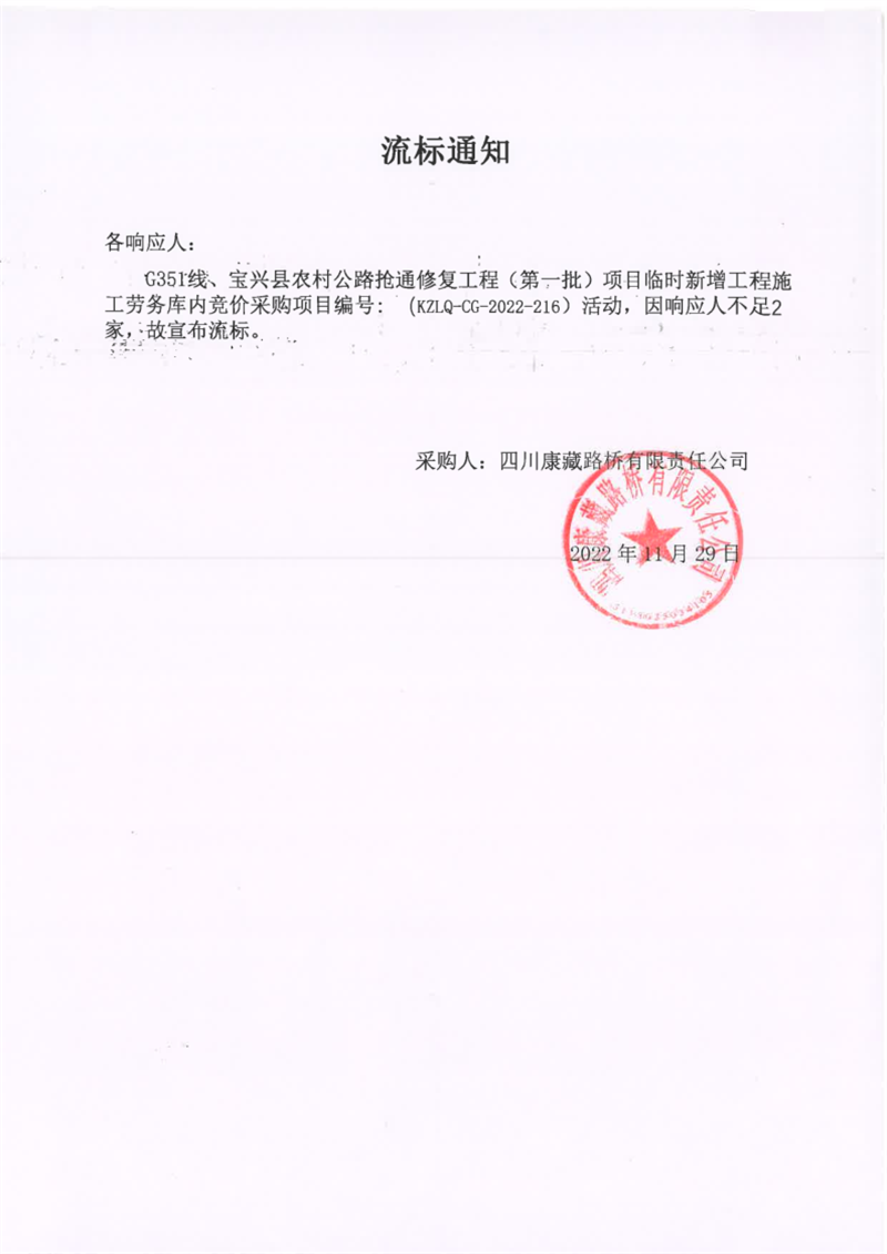 四川康藏路橋有限責任公司G351線、寶興縣農(nóng)村公路搶通修復工程(第一批)項目臨時新增工程施工勞務庫內(nèi)競價采購流標通知