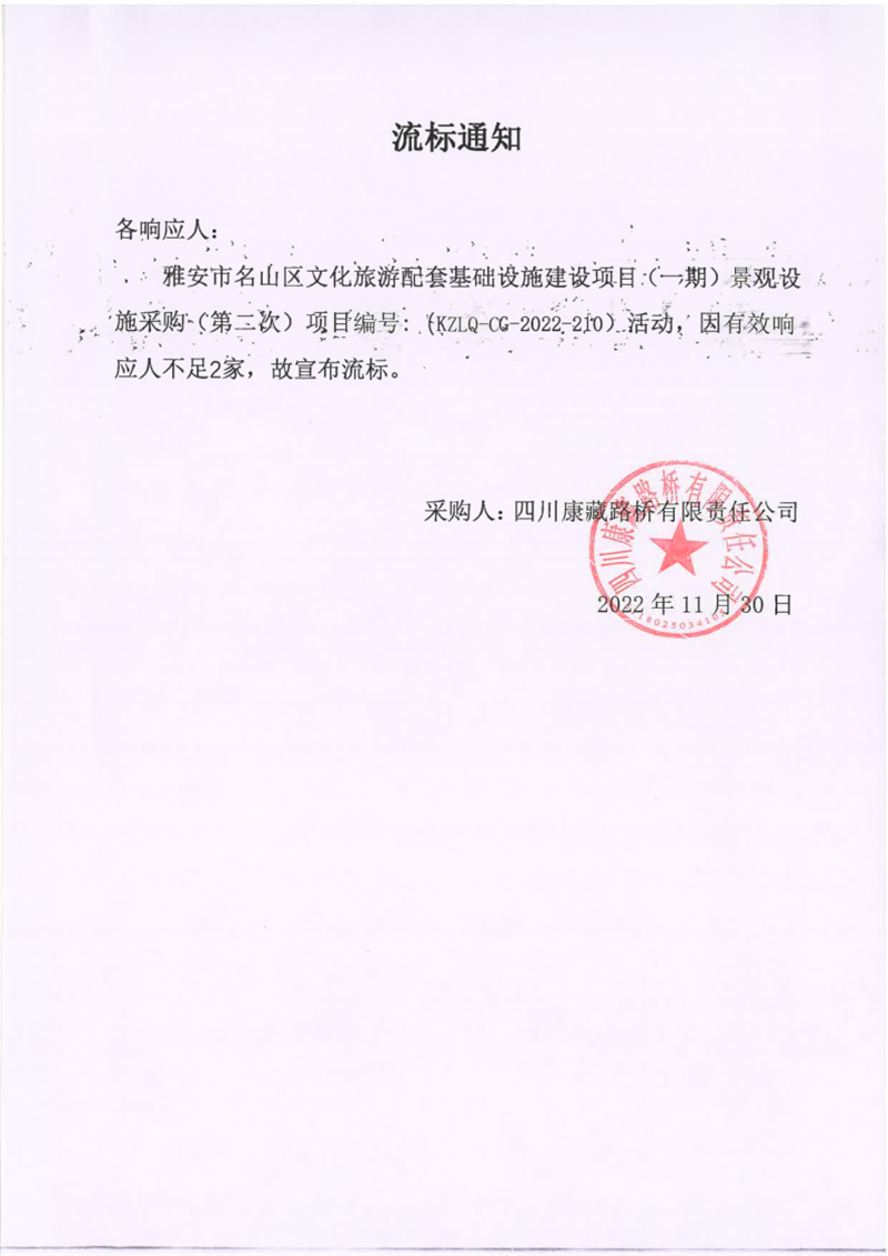 四川康藏路橋有限責任公司雅安市名山區(qū)文化旅游配套基礎設施建設項目(一期)景觀設施采購(第二次)流標通知
