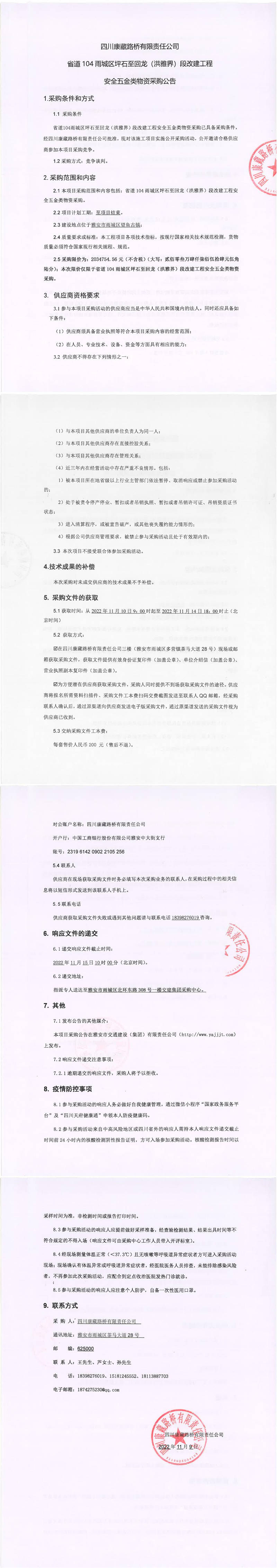 四川康藏路橋有限責任公司省道104雨城區(qū)坪石至回龍(洪雅界)段改建工程安全五金類物資采購公告