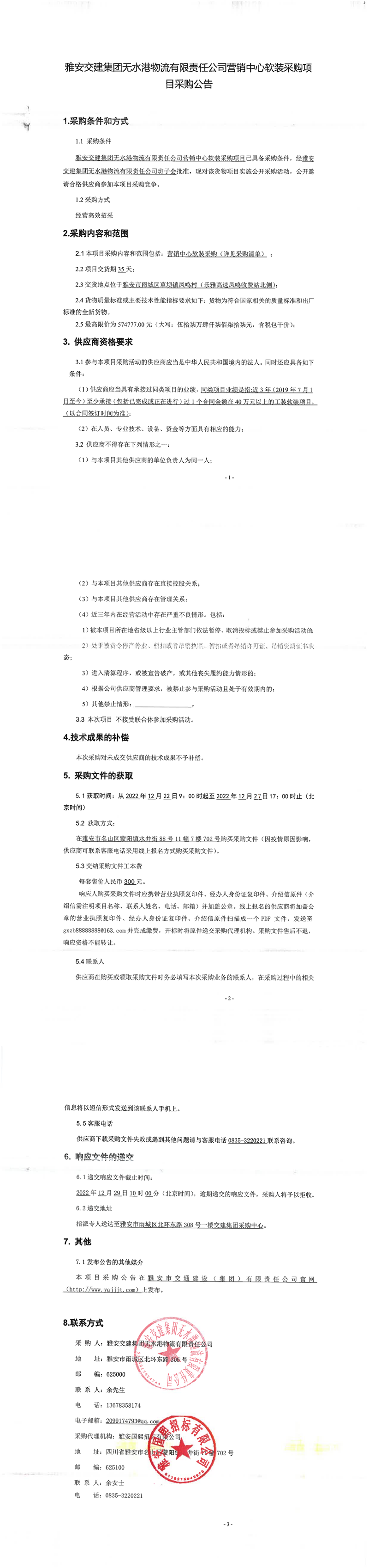 雅安交建集團無水港物流有限責(zé)任公司營銷中心軟裝采購項目采購公告