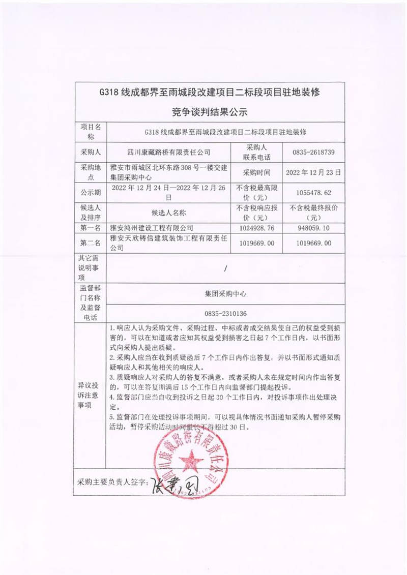 四川康藏路橋有限責(zé)任公司G318線成都界至雨城段改建項(xiàng)目二標(biāo)段項(xiàng)目駐地裝修競(jìng)爭(zhēng)談判結(jié)果公示