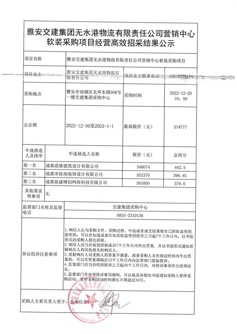雅安交建集團無水港物流有限責任公司營銷中心軟裝采購項目經(jīng)營高效招采結果公示