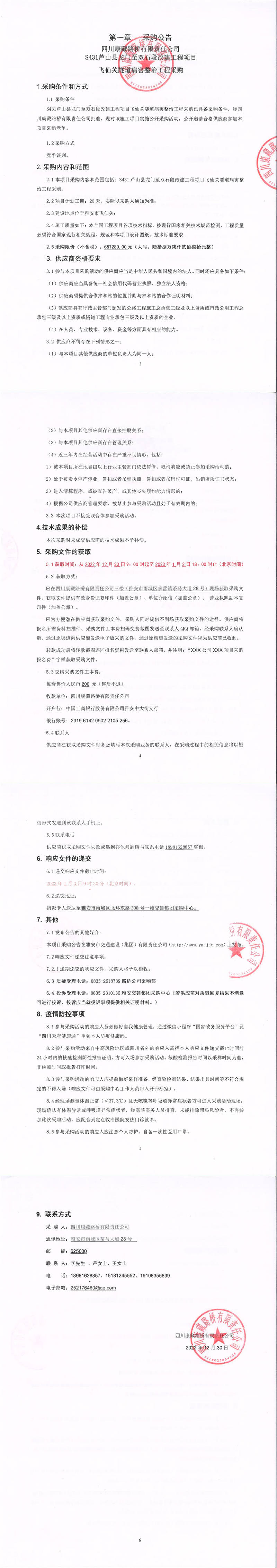 四川康藏路橋有限責(zé)任公司S431蘆山縣龍門(mén)至雙石段改建工程項(xiàng)目飛仙關(guān)隧道病害整治工程采購(gòu)采購(gòu)公告