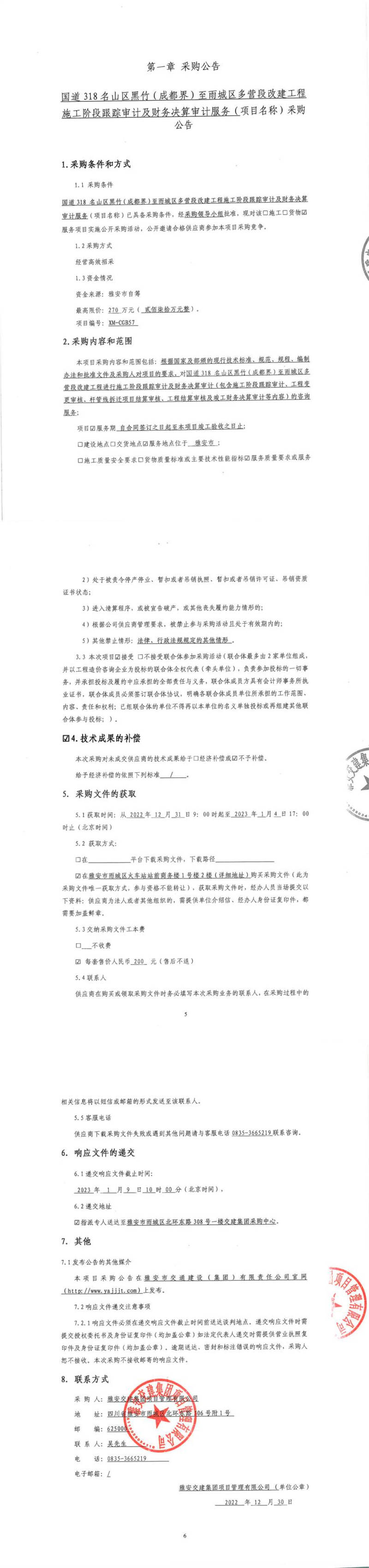 雅安交建集團項目管理有限公司國道318名山區(qū)黑竹(成都界)至雨城區(qū)多營段改建工程施工階段跟蹤審計及財務決算審計服務采購公告