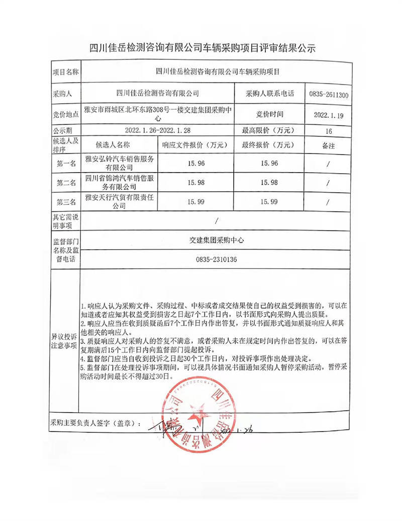 四川佳岳檢測(cè)咨詢有限公司車(chē)輛采購(gòu)項(xiàng)目評(píng)審結(jié)果公示