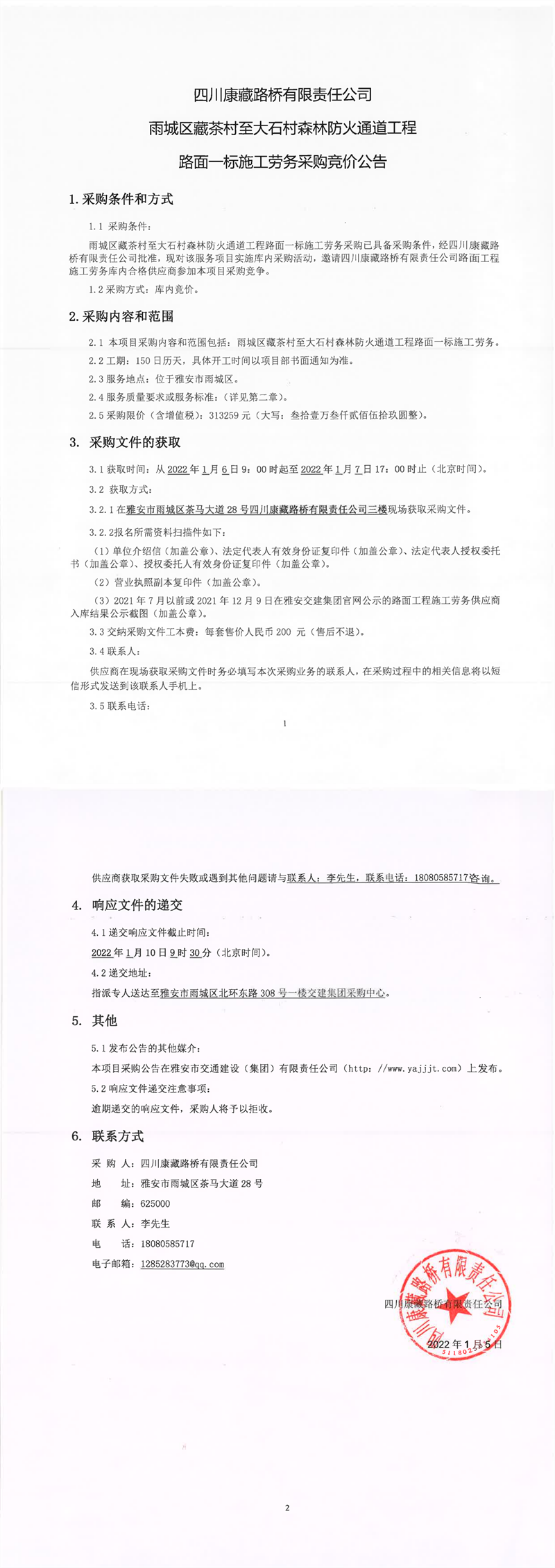 四川康藏路橋有限責(zé)任公司雨城區(qū)藏茶村至大石村森林防火通道工程路面一標(biāo)施工勞務(wù)采購(gòu)競(jìng)價(jià)公告