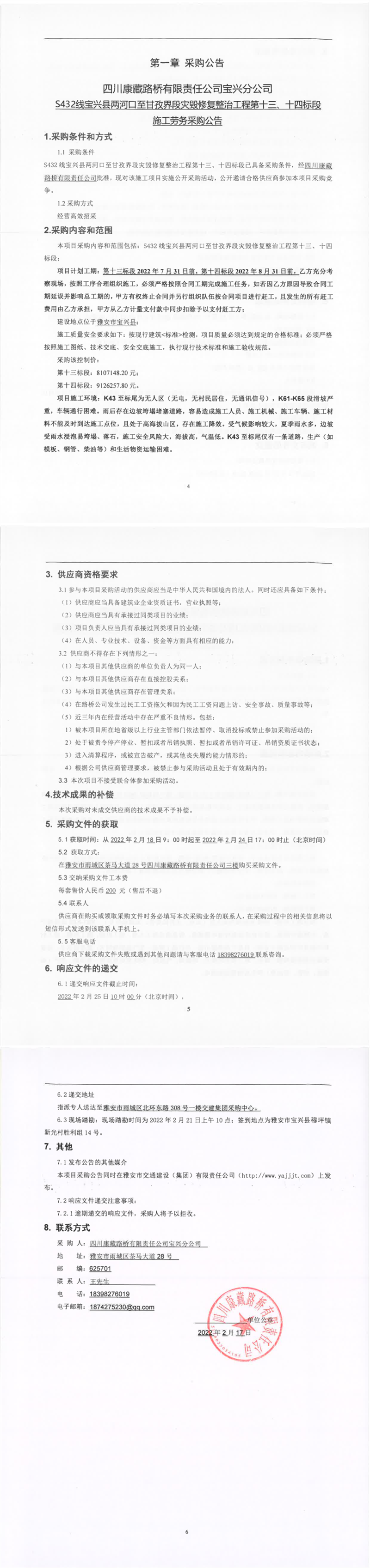 四川康藏路橋有限責任公司S432線寶興縣兩河口至甘孜界段災毀修復整治工程第十三、十四標段施工勞務采購公告