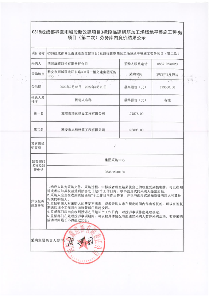 四川康藏路橋有限責(zé)任公司G318線成都界至雨城段新改建項(xiàng)目3標(biāo)段鋼筋加工場場地硬化施工勞務(wù)庫內(nèi)競價結(jié)果公示