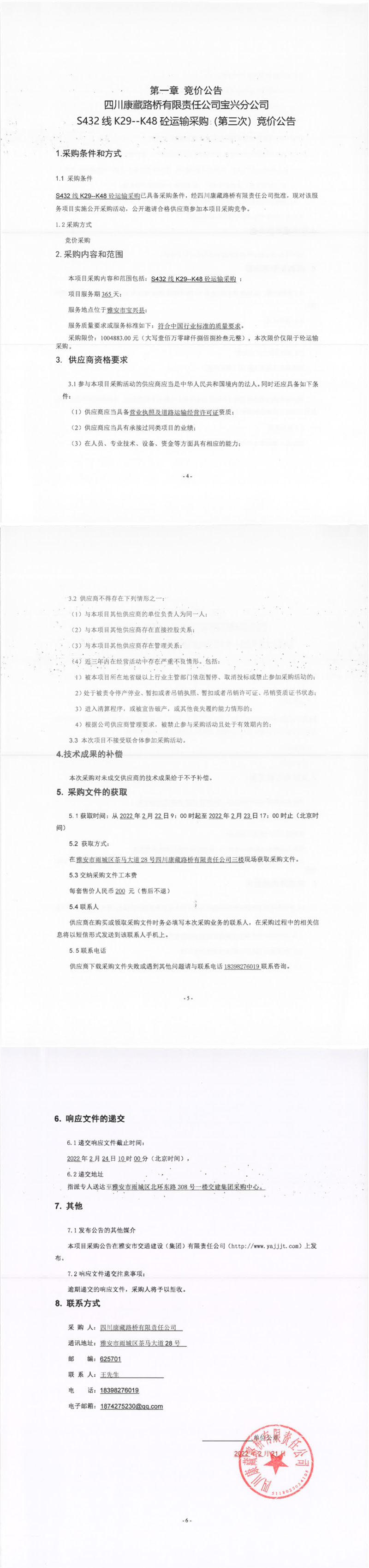 四川康藏路橋有限責任公司寶興分公司S432線K29-K48砼運輸采購(第三次)競價公告