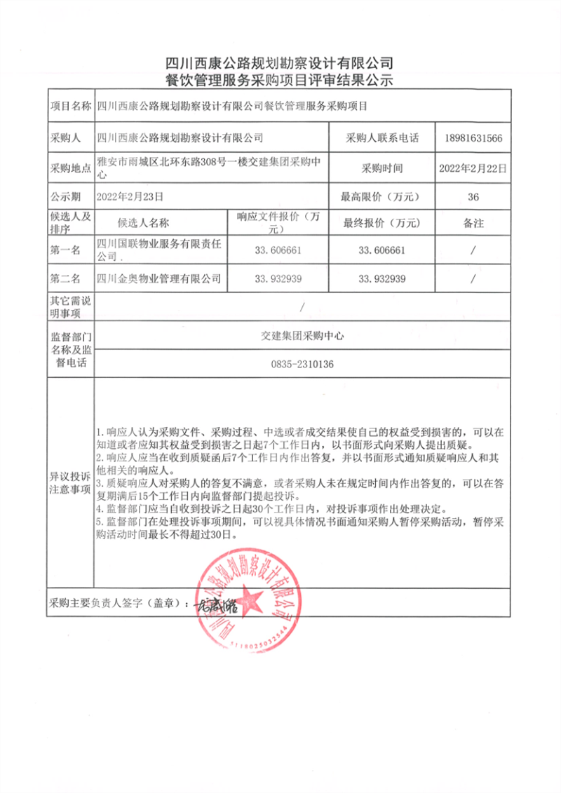 四川西康公路規(guī)劃勘察設(shè)計(jì)有限公司餐飲管理服務(wù)采購(gòu)項(xiàng)目評(píng)審結(jié)果公示