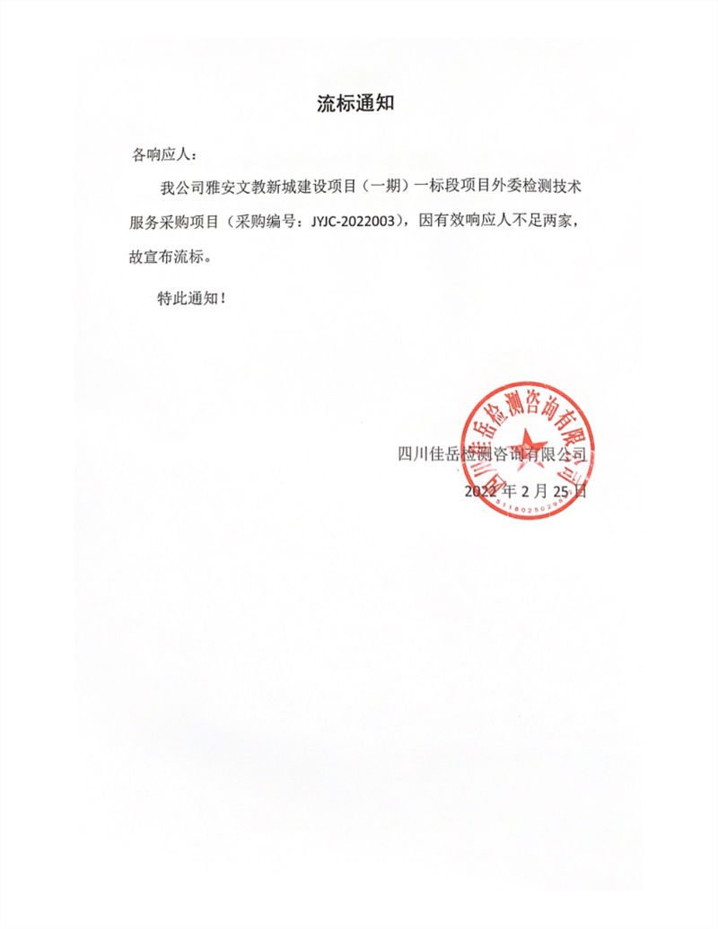 四川佳岳檢測(cè)咨詢有限公司雅安文教新城建設(shè)項(xiàng)目(一期)一標(biāo)段項(xiàng)目外委檢測(cè)技術(shù)服務(wù)采購項(xiàng)目流標(biāo)通知