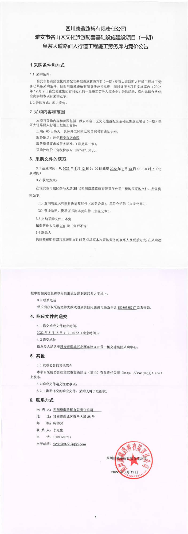 四川康藏路橋有限責任公司雅安市名山區(qū)文化旅游配套基礎設施建設項目(一期)皇茶大道路面人行道工程施工勞務庫內競價公告