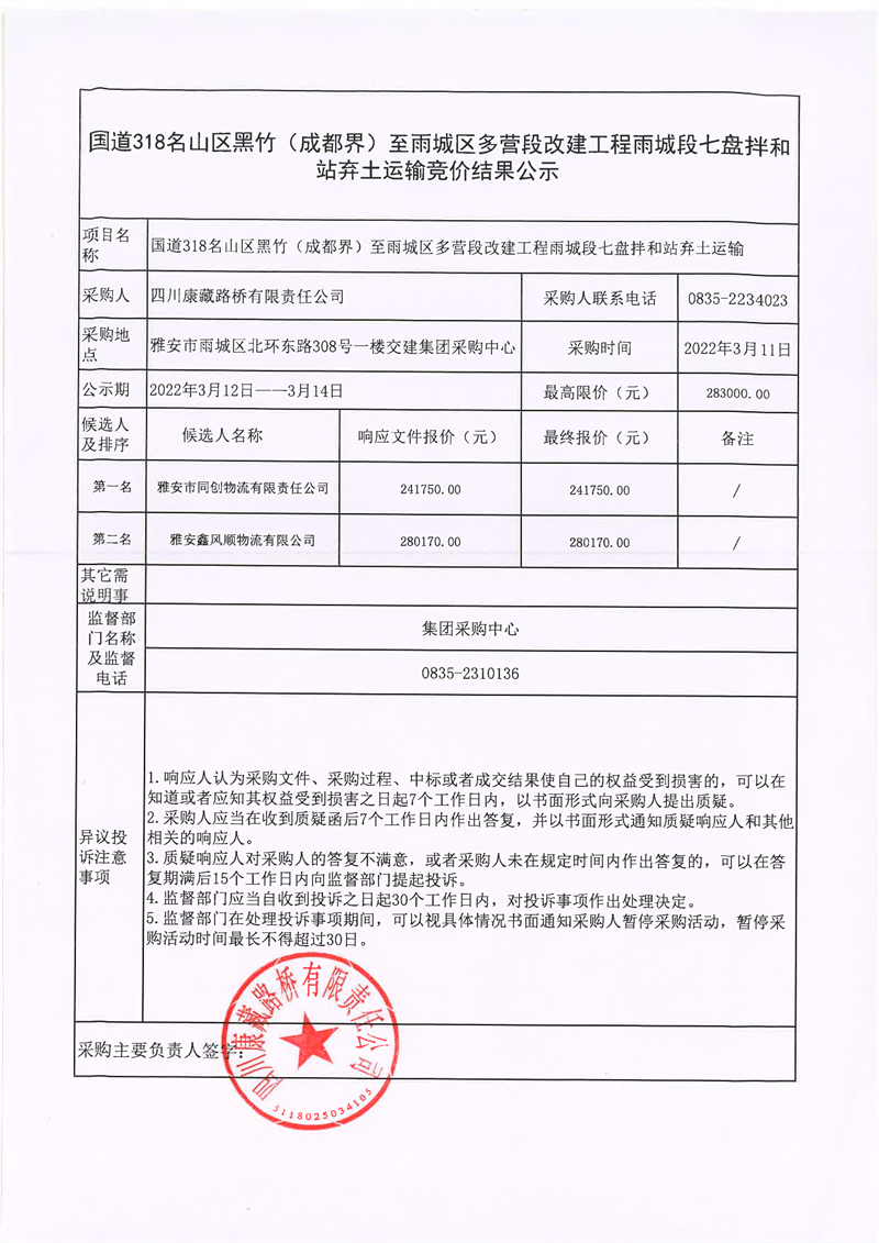 四川康藏路橋有限責(zé)任公司國道318名山區(qū)黑竹(成都界)至雨城區(qū)多營段改建工程雨城段七盤拌和站棄土運(yùn)輸競(jìng)價(jià)結(jié)果公示