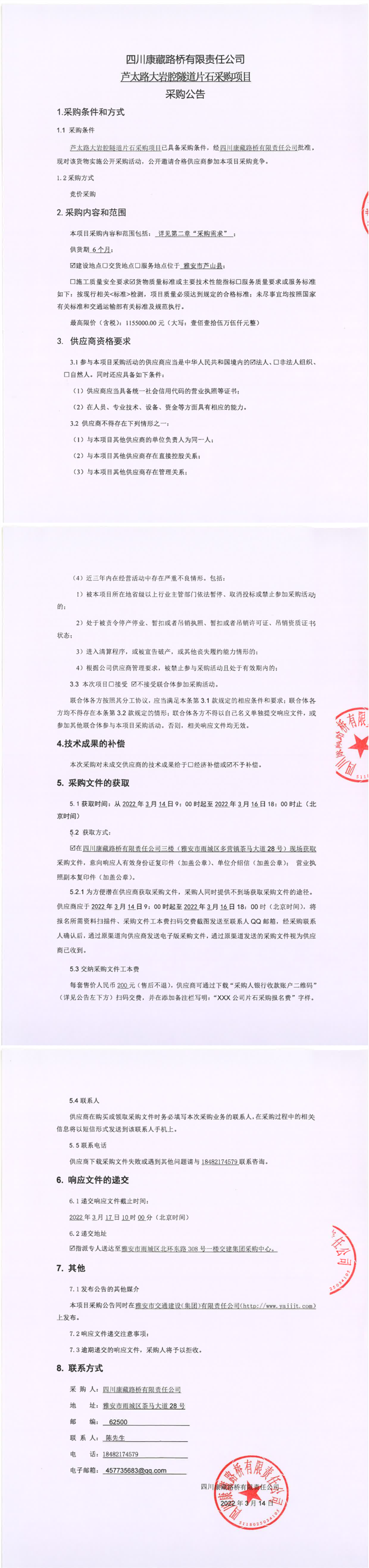 四川康藏路橋有限責(zé)任公司蘆太路大巖腔隧道建渣采購(gòu)項(xiàng)目采購(gòu)公告