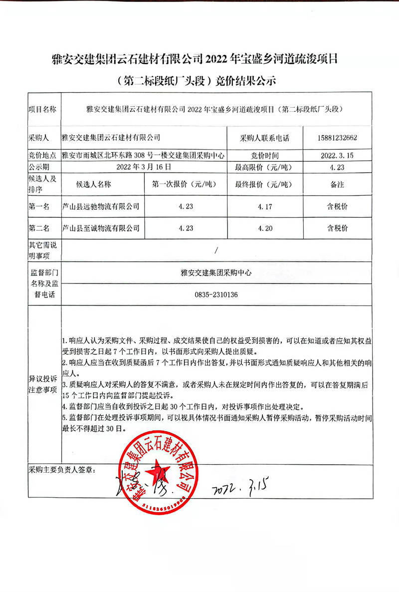雅安交建集團云石建材有限公司2022年寶盛鄉(xiāng)河道疏浚項目(第二標段紙廠頭段)競價結(jié)果公示