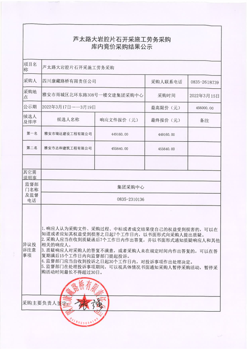 四川康藏路橋有限責(zé)任公司蘆太路大巖腔片石開采施工勞務(wù)采購庫內(nèi)競價采購結(jié)果公示
