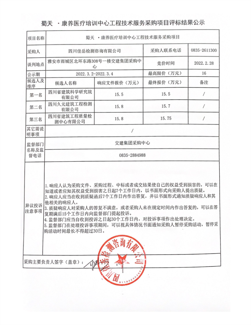 四川佳岳檢測(cè)咨詢有限公司蜀天.康養(yǎng)醫(yī)療培訓(xùn)中心工程技術(shù)服務(wù)采購項(xiàng)目評(píng)標(biāo)結(jié)果公示