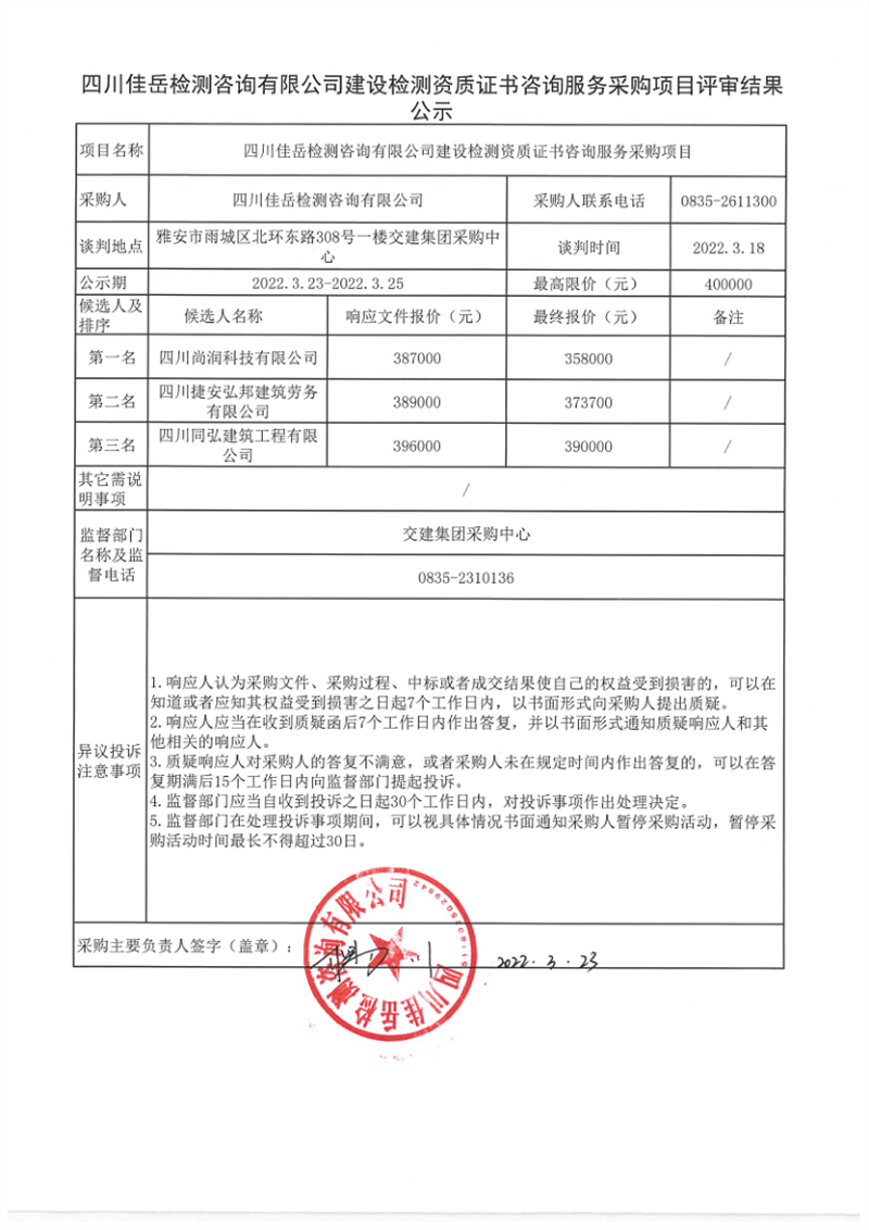 四川佳岳檢測咨詢有限公司建設檢測資質(zhì)證書咨詢服務采購項目評審結(jié)果公示