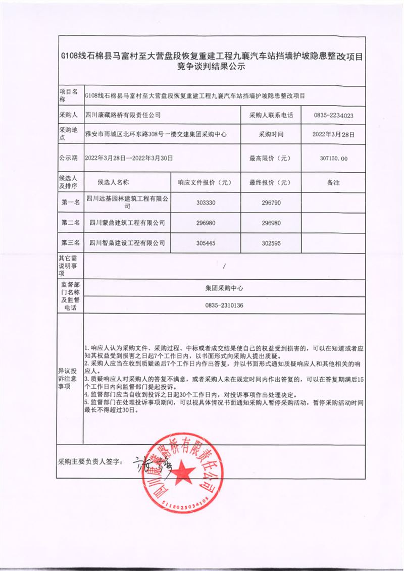 四川康藏路橋有限責(zé)任公司G108線石棉縣馬福村至大營(yíng)盤段恢復(fù)重建九襄汽車站擋墻護(hù)坡隱患整改項(xiàng)目競(jìng)爭(zhēng)談判結(jié)果公示