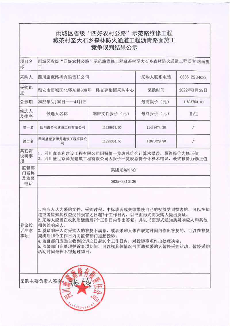 四川康藏路橋有限責(zé)任公司雨城區(qū)省級(jí)“四好農(nóng)村公路”示范路維修工程藏茶村至大石鄉(xiāng)森林防火通道工程瀝青路面施工競(jìng)爭(zhēng)談判結(jié)果公示
