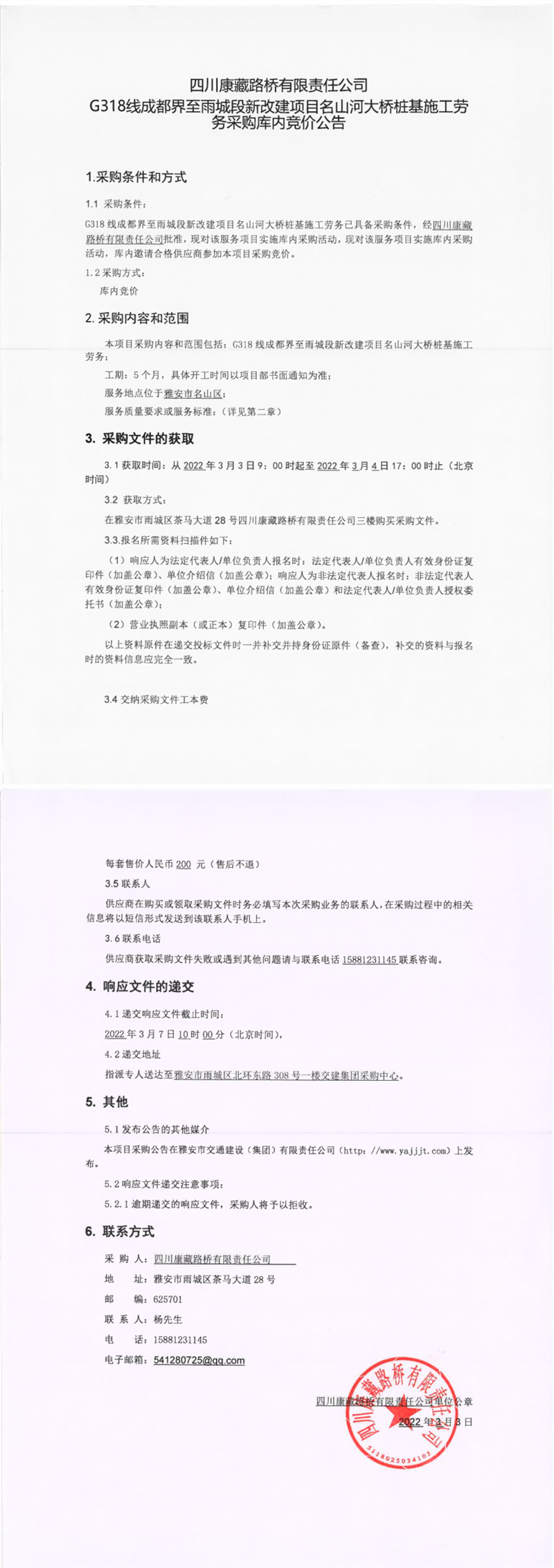 四川康藏路橋有限責任公司G318線成都界至雨城段新改建項目名山河大橋樁基施工勞務采購庫內(nèi)競價公告