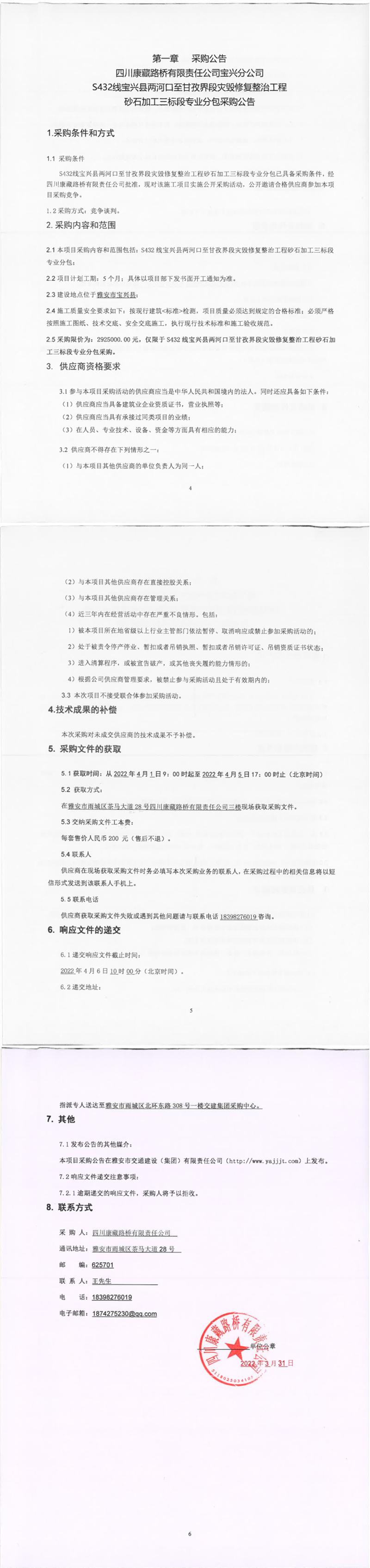 四川康藏路橋有限責(zé)任公司S432線寶興縣兩河口至甘孜界段災(zāi)毀修復(fù)整治工程砂石加工三標(biāo)段專業(yè)分包采購公告