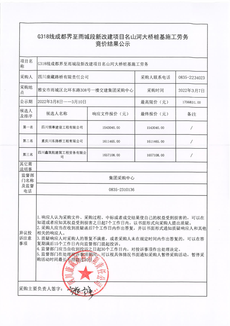 四川康藏路橋有限責(zé)任公司G318線成都界至雨城段新改建項(xiàng)目名山河大橋樁基施工勞務(wù)競(jìng)價(jià)結(jié)果公示