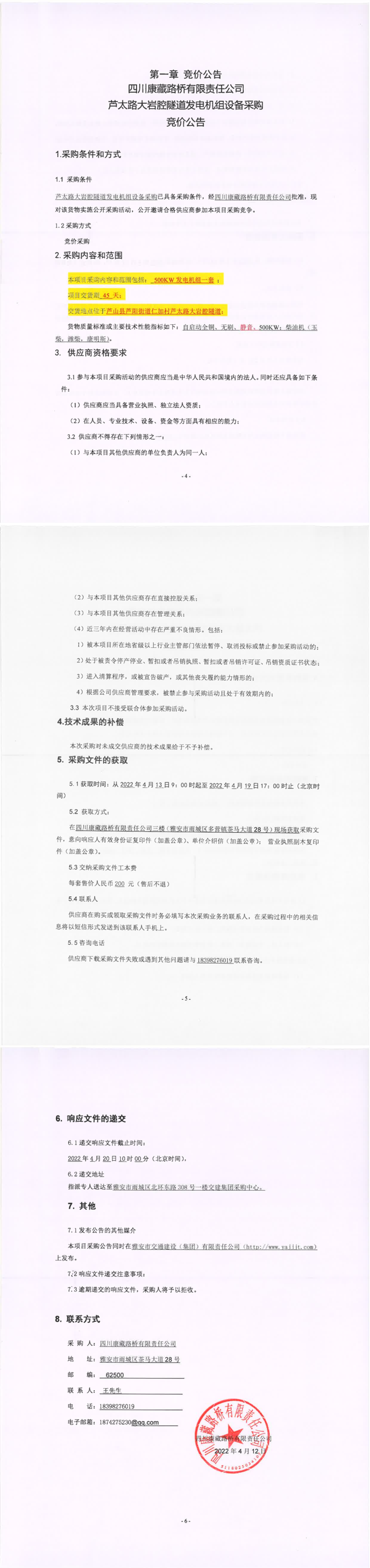 四川康藏路橋有限責(zé)任公司蘆太路大巖腔隧道發(fā)電機(jī)組設(shè)備采購競價公告