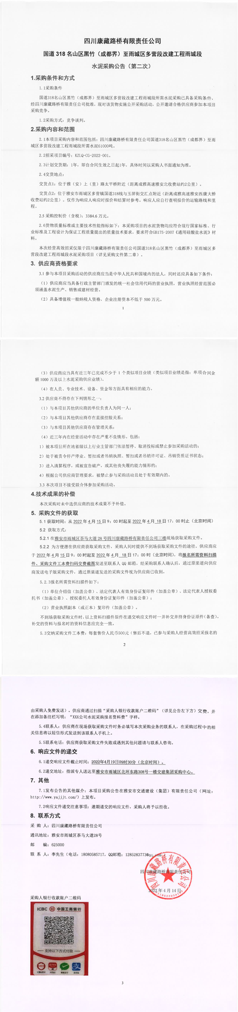 四川康藏路橋有限責(zé)任公司國(guó)道318名山區(qū)黑竹(成都界)至雨城區(qū)多營(yíng)段改建工程雨城段水泥采購(gòu)公告(第二次)