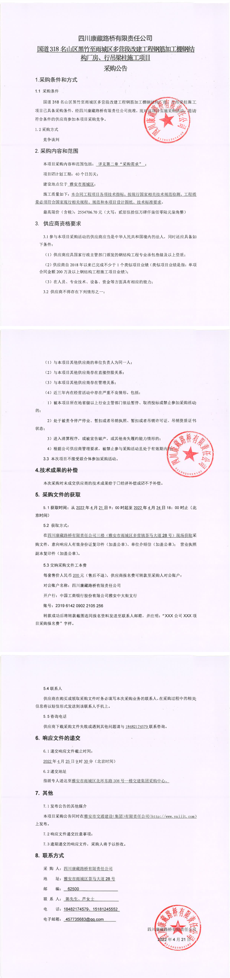 四川康藏路橋有限責(zé)任公司國道318名山區(qū)黑竹至雨城區(qū)多營段改建工程鋼筋加工棚鋼結(jié)構(gòu)廠房、行吊梁柱施工項目采購公告