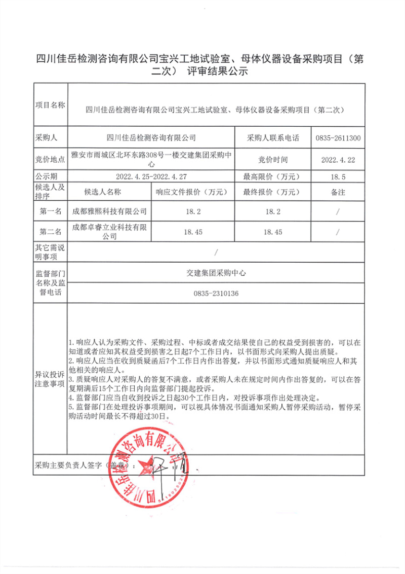 四川佳岳檢測咨詢有限公司寶興工地試驗室、母體儀器設(shè)備采購項目(第二次)評審結(jié)果公示