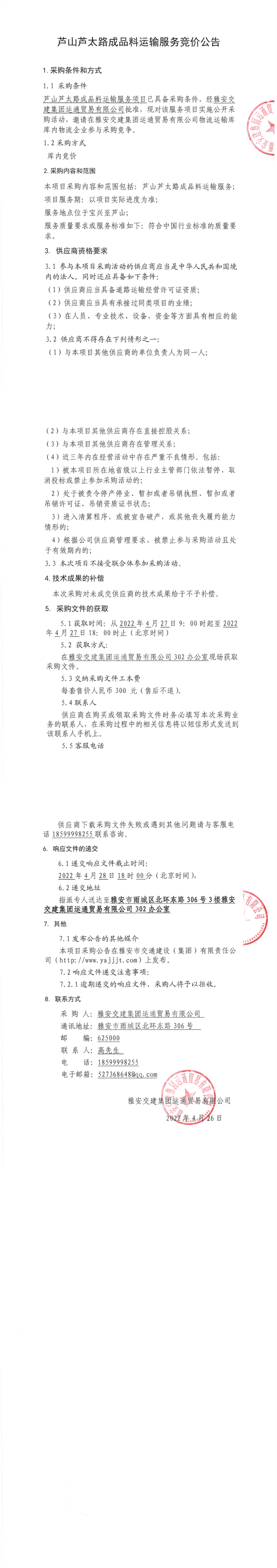 雅安交建集團(tuán)運(yùn)通貿(mào)易有限公司蘆山蘆太路成品料運(yùn)輸服務(wù)競價公告