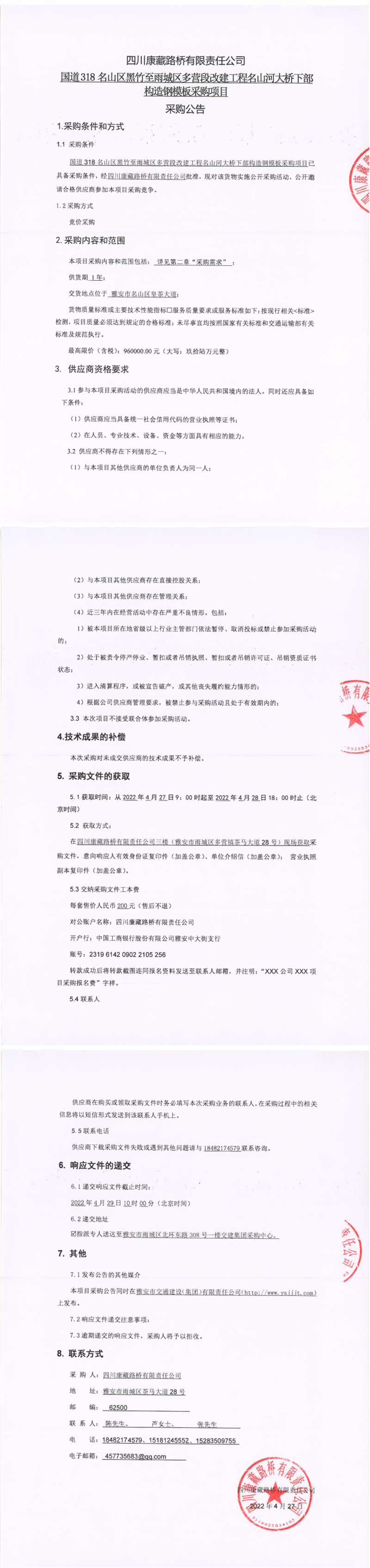 四川康藏路橋有限責(zé)任公司國(guó)道318名山區(qū)黑竹至雨城區(qū)多營(yíng)段改建工程名山河大橋下部構(gòu)造鋼模板采購(gòu)項(xiàng)目采購(gòu)公告