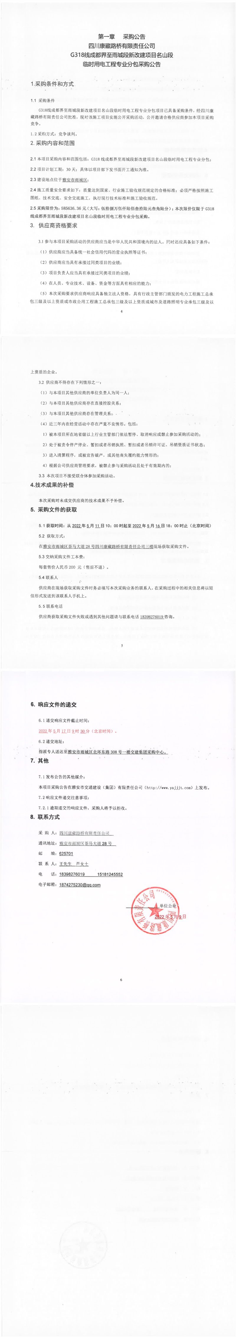 四川康藏路橋有限責(zé)任公司G318線成都界至雨城段新改建項(xiàng)目名山段臨時(shí)用電工程專業(yè)分包采購(gòu)公告