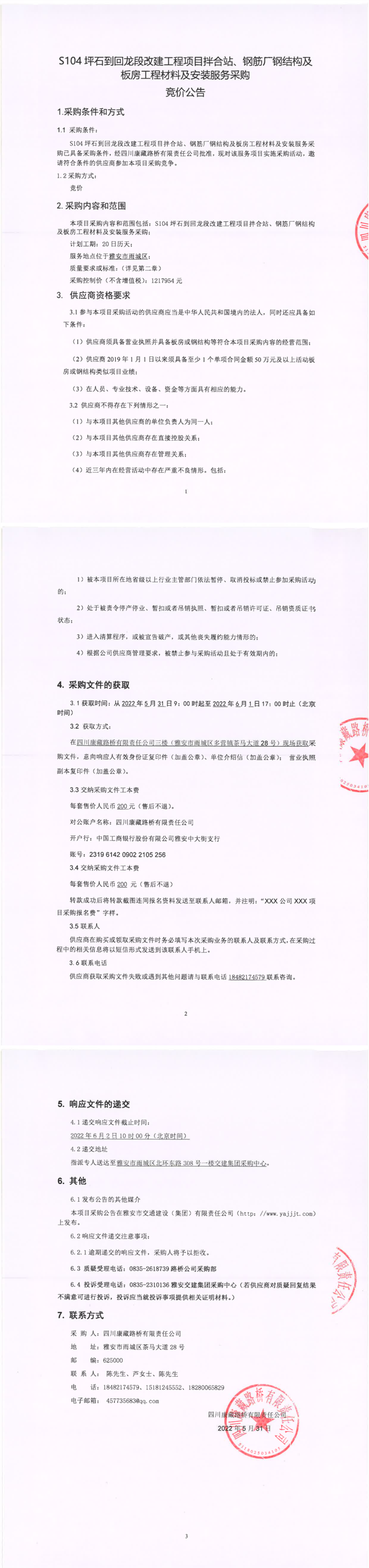 四川康藏路橋有限責任公司S104坪石到回龍段改建工程項目拌合站、鋼筋廠鋼結(jié)構(gòu)及板房工程材料及安裝服務(wù)采購競價公告