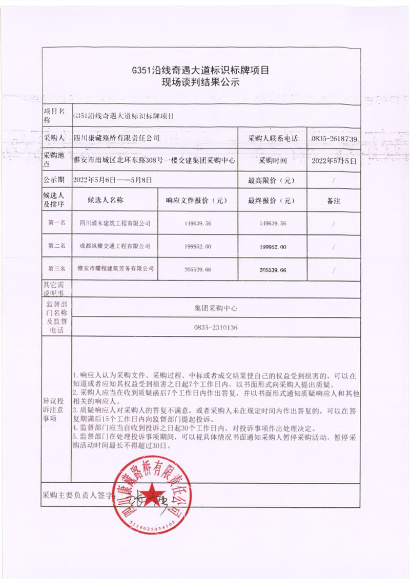 四川康藏路橋有限責(zé)任公司G351沿線奇遇大道標(biāo)識(shí)標(biāo)牌項(xiàng)目現(xiàn)場談判結(jié)果公示