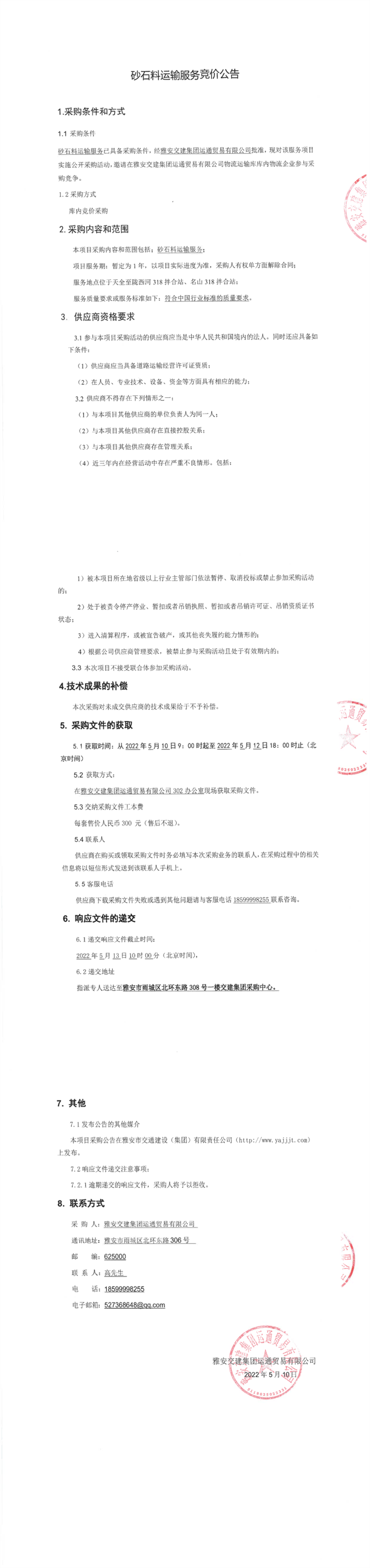 雅安交建集團運通貿(mào)易有限公司砂石料運輸服務競價公告