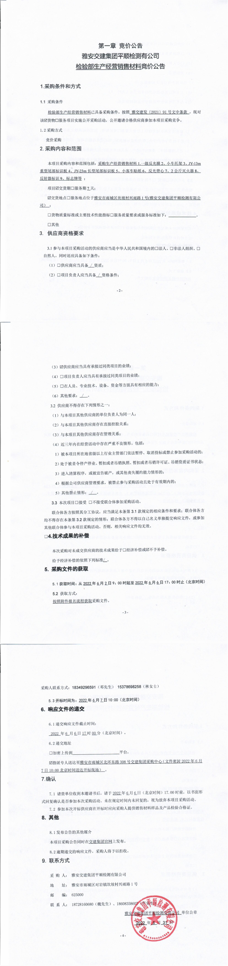 雅安交建集團(tuán)平順檢測(cè)有限公司檢驗(yàn)部生產(chǎn)經(jīng)營(yíng)銷售材料競(jìng)價(jià)公告