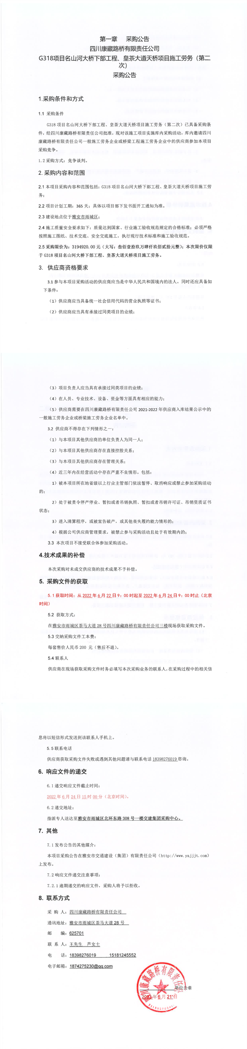 四川康藏路橋有限責任公司G318項目名山河大橋下部工程、皇茶大道天橋項目施工勞務(第二次)采購公告