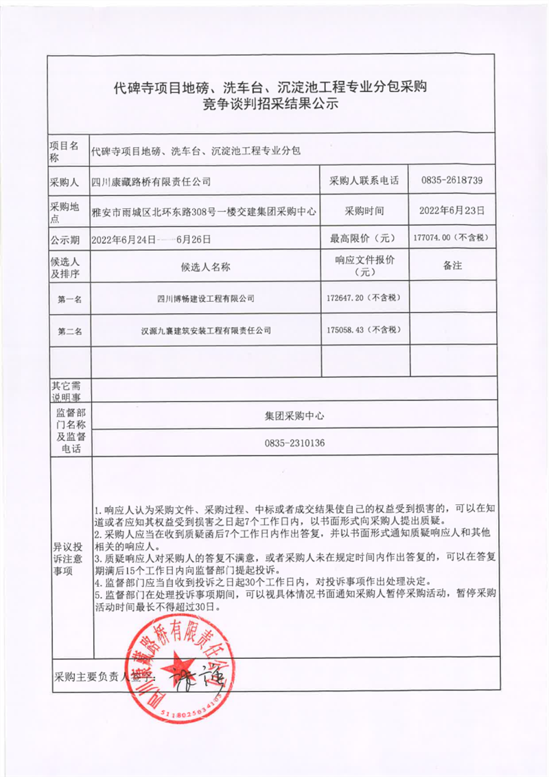 四川康藏路橋有限責(zé)任公司代碑寺項(xiàng)目地磅、洗車臺(tái)、沉淀池工程專業(yè)分包采購競(jìng)爭談判招采結(jié)果公示