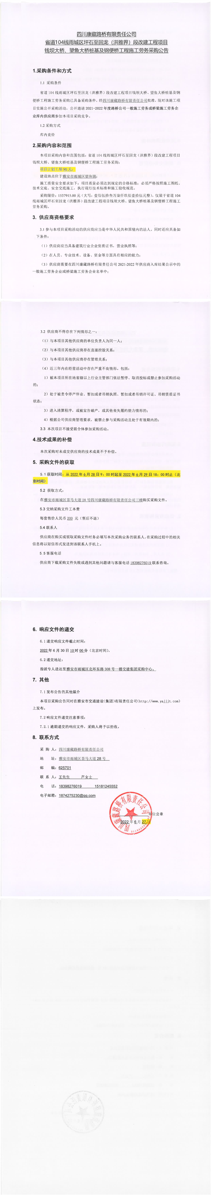 四川康藏路橋有限責任公司G318項目名山河大橋下部工程、皇茶大道天橋項目施工勞務采購(第二次)競爭談判采購結(jié)果公示