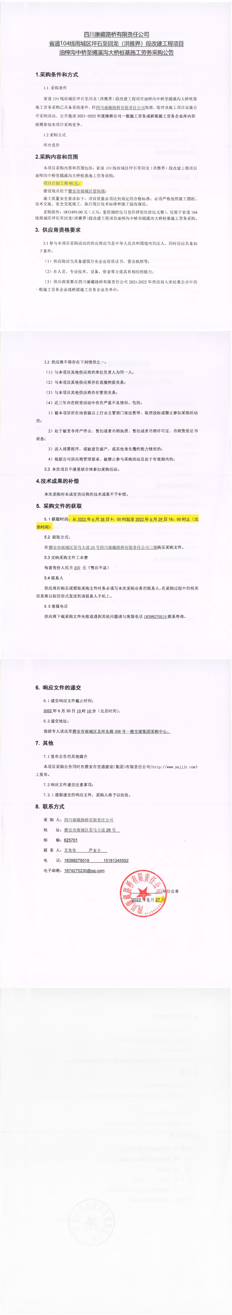 四川康藏路橋有限責(zé)任公司省道104線雨城區(qū)坪石至回龍(洪雅界)段改建工程項(xiàng)目錢壩大橋、望魚(yú)大橋樁基及鋼便橋工程施工勞務(wù)采購(gòu)公告