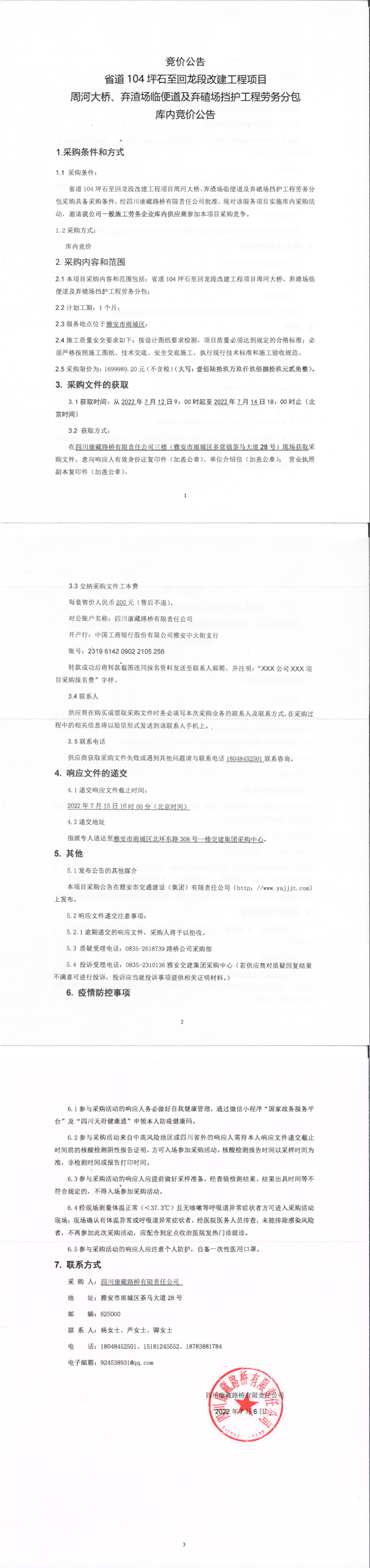 四川康藏路橋有限責(zé)任公司省道104坪石至回龍段改建工程項(xiàng)目周河大橋、棄渣場臨便道及棄碴場擋護(hù)工程勞務(wù)分包庫內(nèi)競價(jià)公告