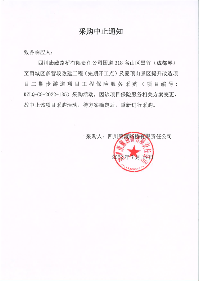 四川康藏路橋有限責(zé)任公司國道318名山區(qū)黑竹(成都界)至雨城區(qū)多營段改建工程(先期開工點(diǎn))及蒙頂山景區(qū)提升改造項目二期步游道項目工程保險服務(wù)采購中止通知