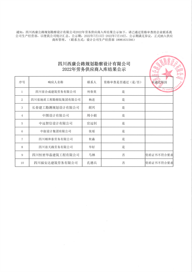 四川西康公路規(guī)劃勘察設計有限公司2022年勞務供應商入庫結果公示