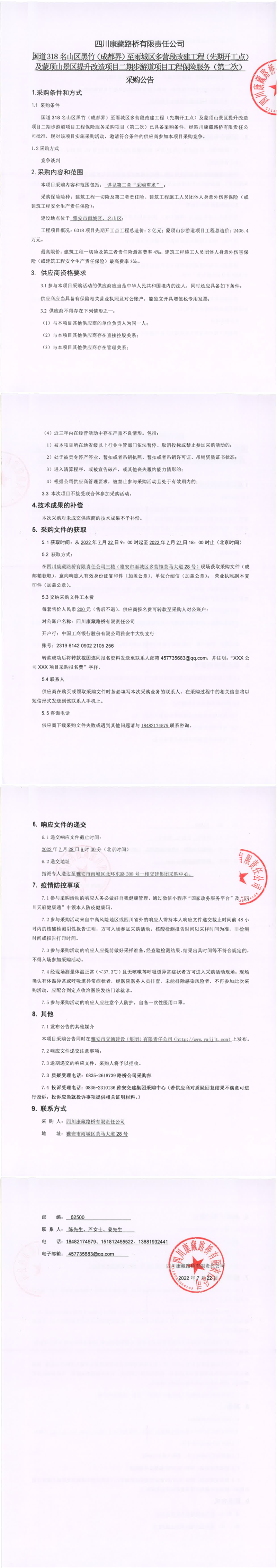 四川康藏路橋有限責任公司國道318名山區(qū)黑竹(成都界)至雨城區(qū)多營段改建工程(先期開工點)及蒙頂山景區(qū)提升改造項目二期步游道項目工程保險服務(wù)(第二次)采購公告