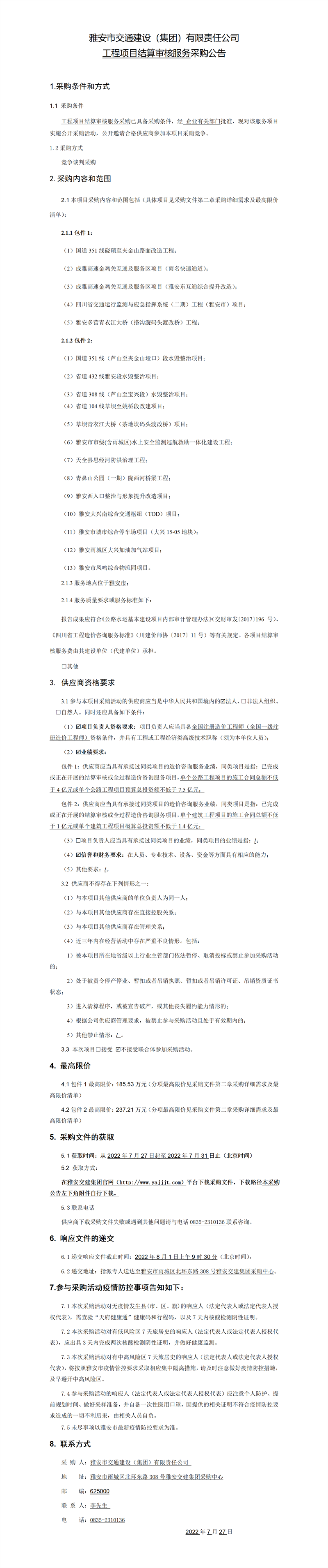 雅安市交通建設(shè)(集團(tuán))有限責(zé)任公司工程項目結(jié)算審核服務(wù)采購公告