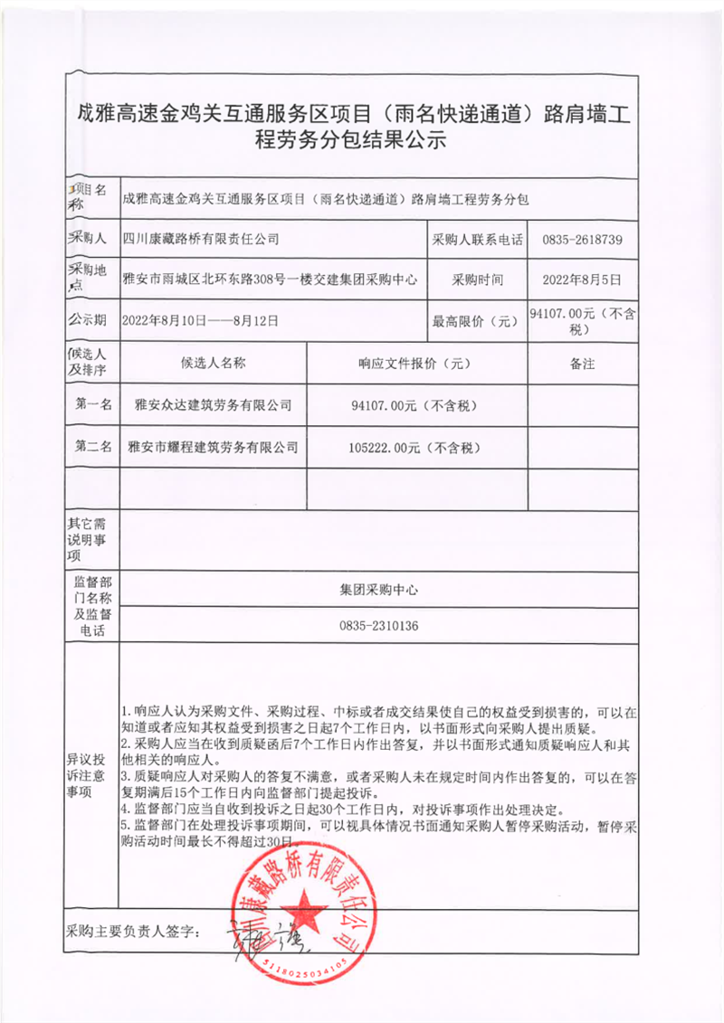 四川康藏路橋有限責(zé)任公司成雅高速金雞關(guān)互通服務(wù)區(qū)項(xiàng)目(雨名快速通道)路肩墻工程勞務(wù)分包結(jié)果公示