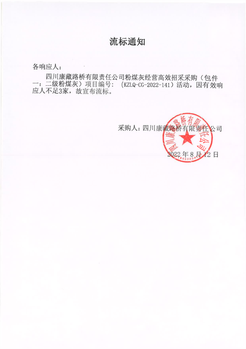 四川康藏路橋有限責(zé)任公司粉煤灰經(jīng)營高效招采采購(包件一:二級(jí)粉煤灰)流標(biāo)通知