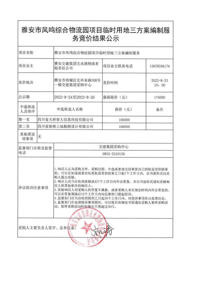 雅安交建集團(tuán)無水港物流有限責(zé)任公司雅安市鳳鳴綜合物流園項目臨時用地三方案編制服務(wù)競價結(jié)果公示